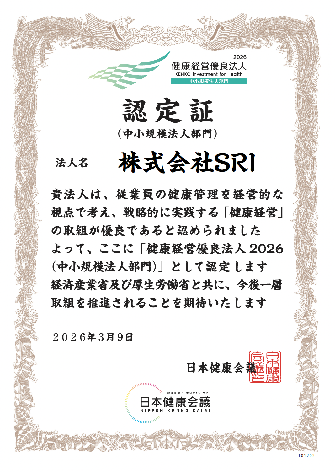 株式会社SRI(社長:北村 真)では、経済産業省と日本健康会議が共同で選定する「健康経営優良法人認定制度」において、3月9日(月)に「健康経営優良法人2026」(中小規模法人部門)に認定されました。